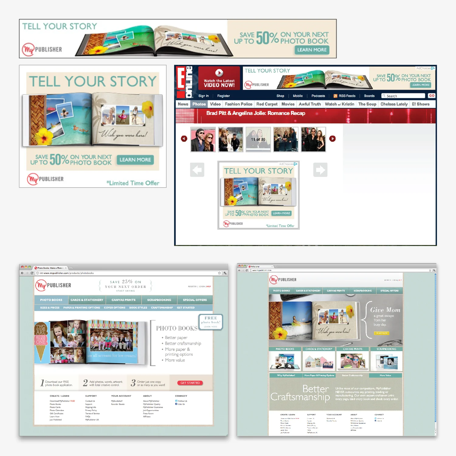 MyPublisher.com is an online photo book and greeting card company. The following designs were created for use on their web site as sample designs and in their advertisements. Scroll to bottom of page to see samples of online ads using my layout designs.